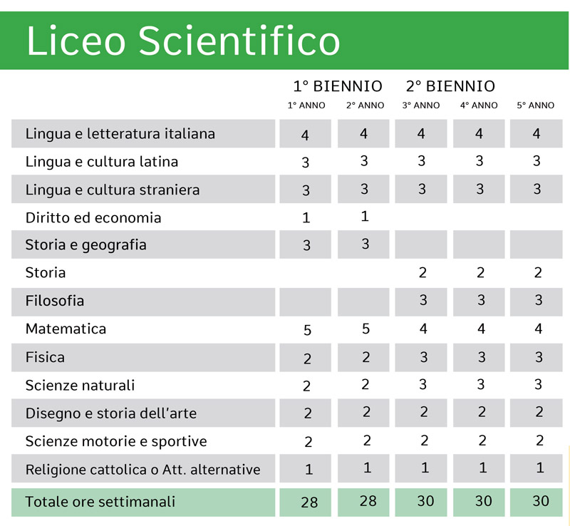 Il Liceo Scientifico è indirizzato all’approfondimento della cultura scientifica (matematica, fisica, scienze naturali) in sintonia con lo studio delle materie letterarie ed umanistiche.